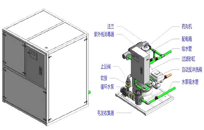 水處理系統包含循環、過濾、加熱、消毒等配套相關水處理設備,目前水處理系統的施工大部分均在市場上-一采購相關水處理設備,再運抵現場組裝整合。因各設備接口型號的差異,及機房施工條件的限制,對施工人員的安裝技術、配件采購人員臨場施工采購能力均有較高的要求。運營過程中的維護,多需要人工手動切換相關的閥門,再操作控制系統,維護難度高,人工成本增加。